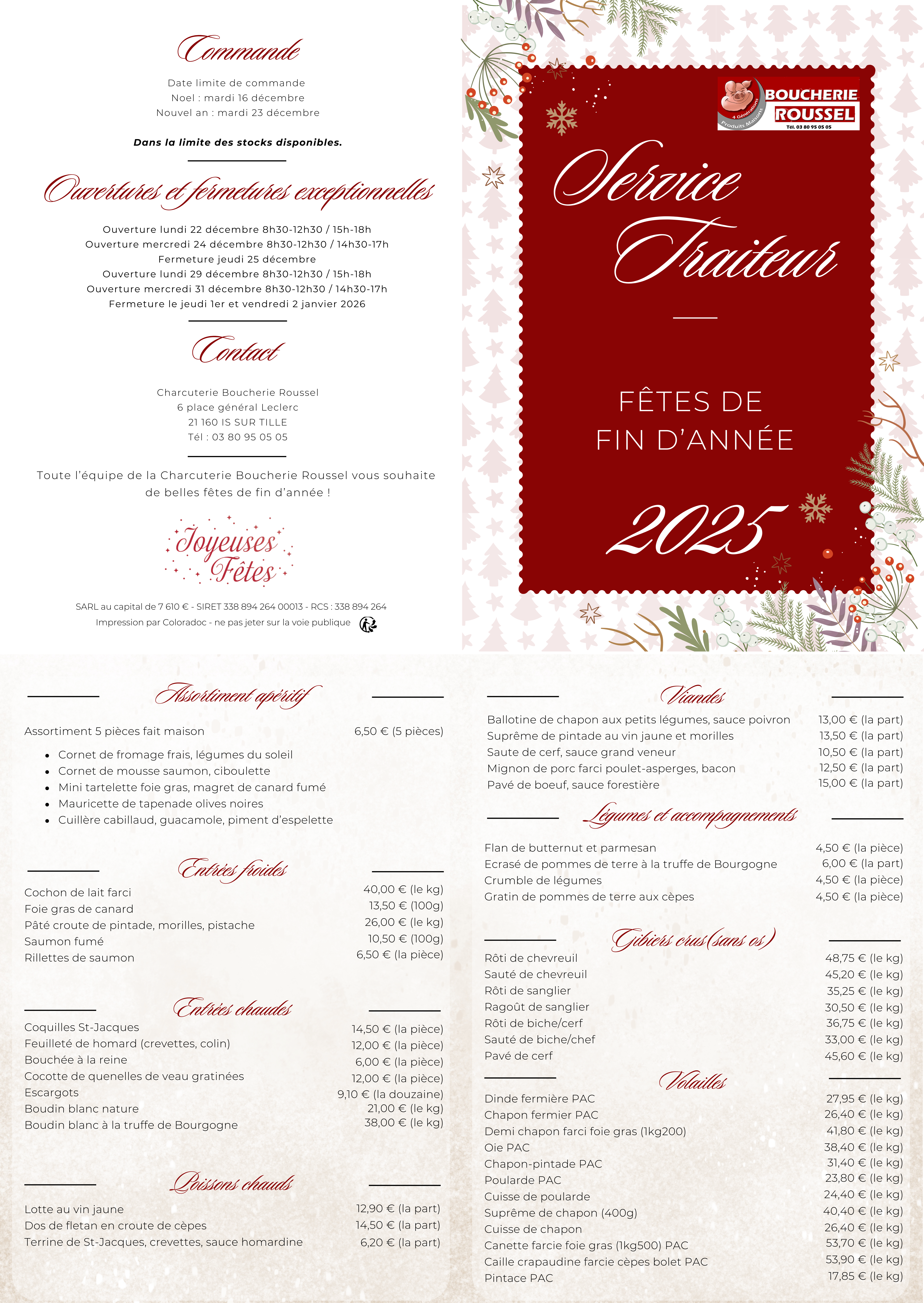 Un menu traiteur est mis en place chaque fin de semaine sur réservation.